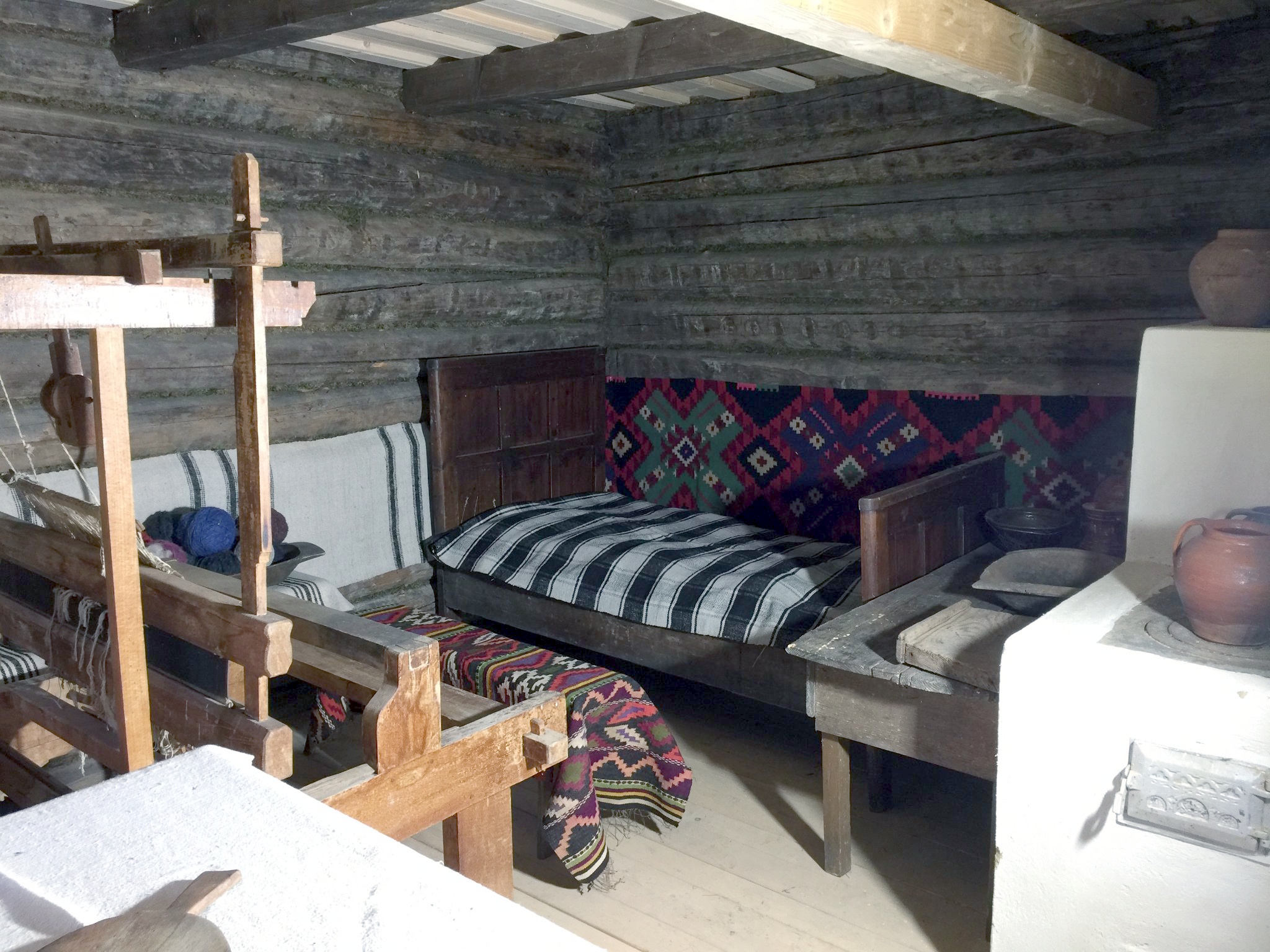 За пічкою знаходиться ліжко. Воно покрито соломою та вкрито ліжником. Над ліжком висить горизонтальний килим прикрашений геометричним орнаментом. Над ним – жердка з буденним одягом. Між ліжком та чільною стіною знаходиться ткацький верстат («кросна»). На причілковій стіні висить ікона. Вздовж чільної стіни – лава. Зліва від пічки, у кутку, по іншу сторону дверей стоїть креденс для посуду. Біля нього – стіл. Він вкритий скатертиною. На ньому – кружок для кулеші, миска та макітра. Поряд зі столом – ослін.