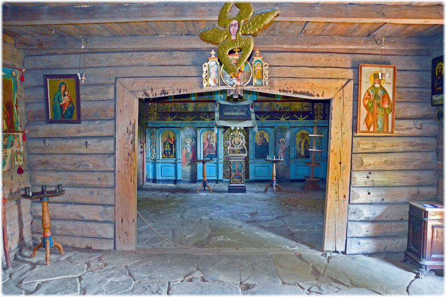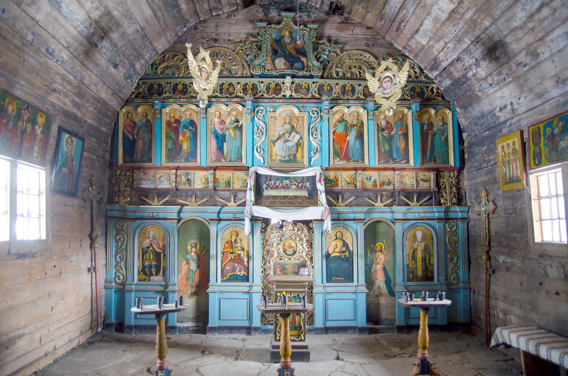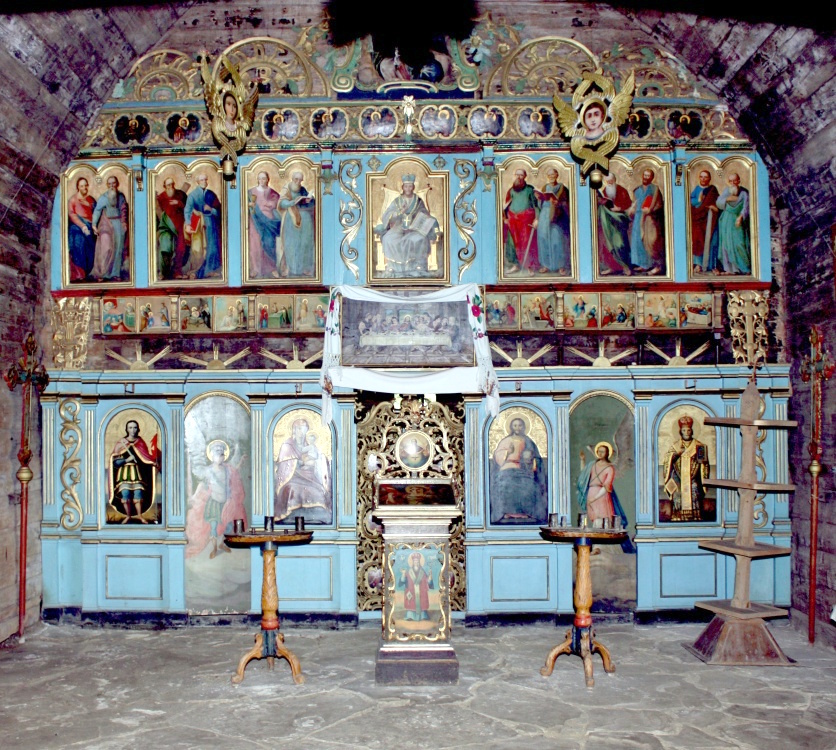 Окрасою церкви є іконостас, який вважається зримим зображенням свідків небесних в тілесній оболонці, тобто така собі ілюстрація Небесного царства Божого. Виписаний на східній стіні центрального зрубу, на колодах покритих спеціальним грунтом іконостас, внаслідок недбалого поводження із будівлею, зазнав руйнування і не підлягав відновленню. Іконостас, який ви бачите перед собою сьогодні зібраний із частин , що вціліли по закритих свого часу церквах і були майстерно відновлені. В першому «намісному» ряді знаходяться ікони: «Богоматір з немовлям» (ліворуч царської брами) та «Христос Пантократор» праворуч, а також ікони «Св. Дмитрій» та «Св. Миколай». В центрі намісного ряду – різьблена царська БРАМА, м.Чернвці прикрашена медальйонами з традиційними зображеннями «Благовіщення» та євангелістів із символами.